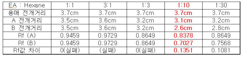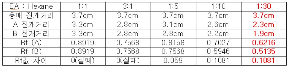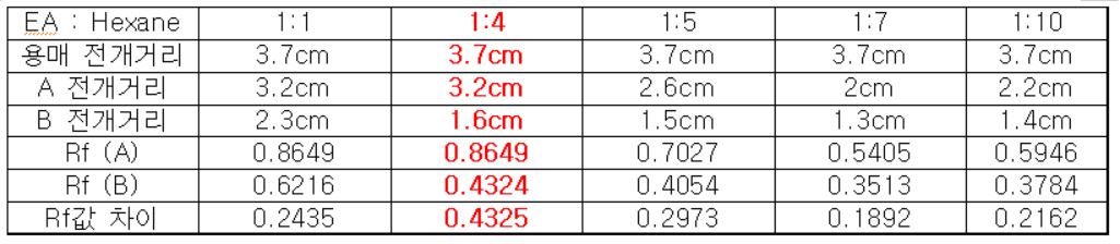 (3)번 실험의 경우, Nitropenol은 EA : Hexane의 비율이 1:4 일 때, 가장 큰 Rf 값의 차이를 보였다.