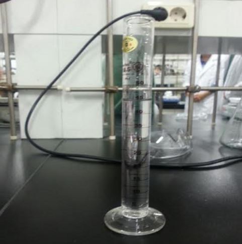 8. 증류되지 않은 액체 혼합물과 증류된 혼합물을 눈금 실린더를 이용하여 부피를 측정한다.